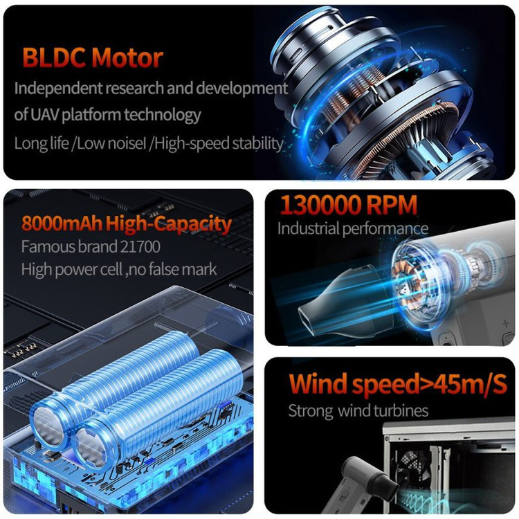 قدرت دمندگی بالا: سرعت چرخش موتور تا 130000 دور در دقیقه (RPM)، با تولید باد پرفشار برای تمیزکاری عمیق